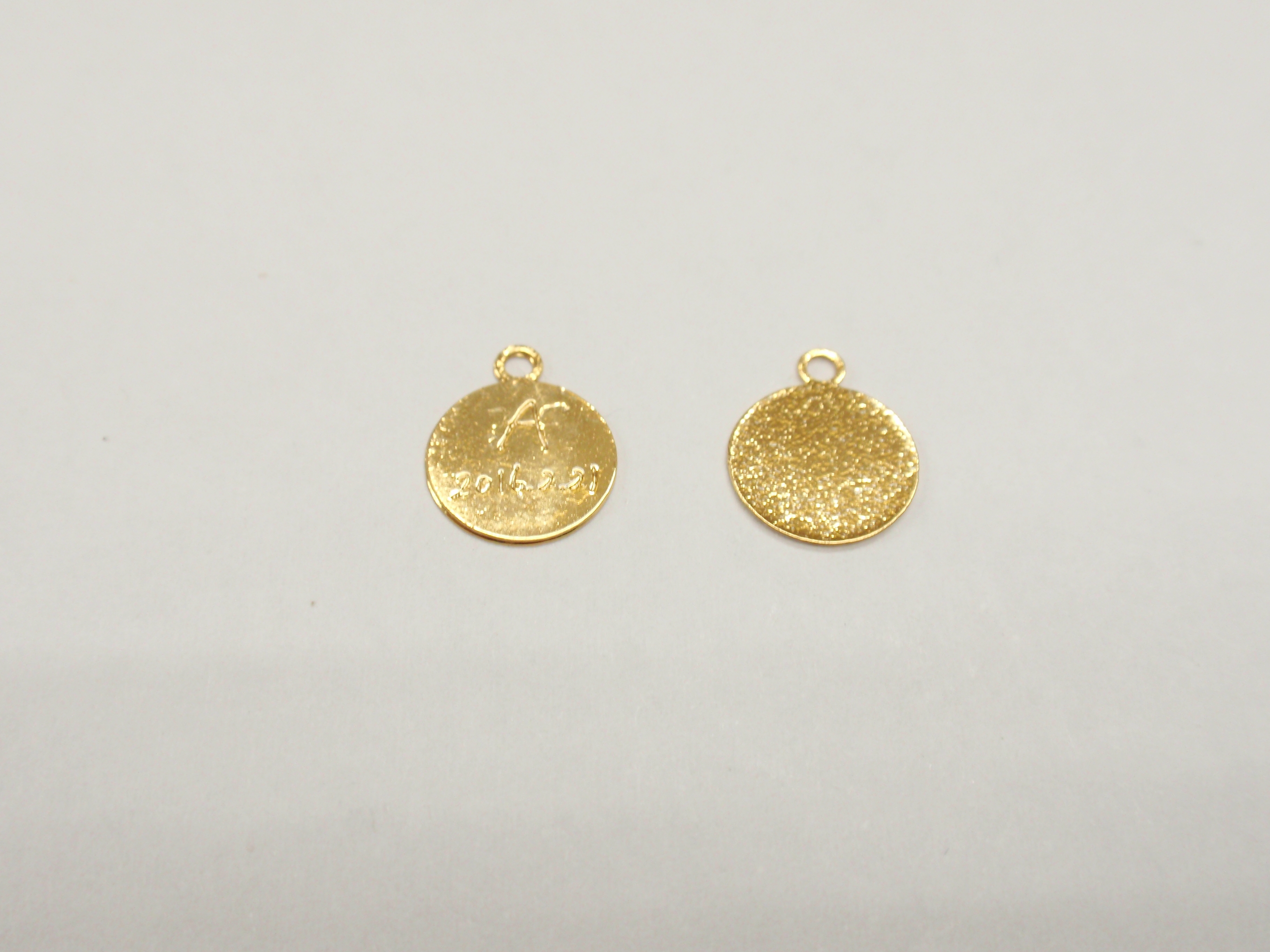 お客様の要望で、文字の配置などをこちらで考えて、頂いた文字を加工する為に書き写したりして製作をさせて頂いたのですが、このチャームも0.8ミリと1ミリに満たないものだったので、文字を入れる工夫をさせて頂きました。