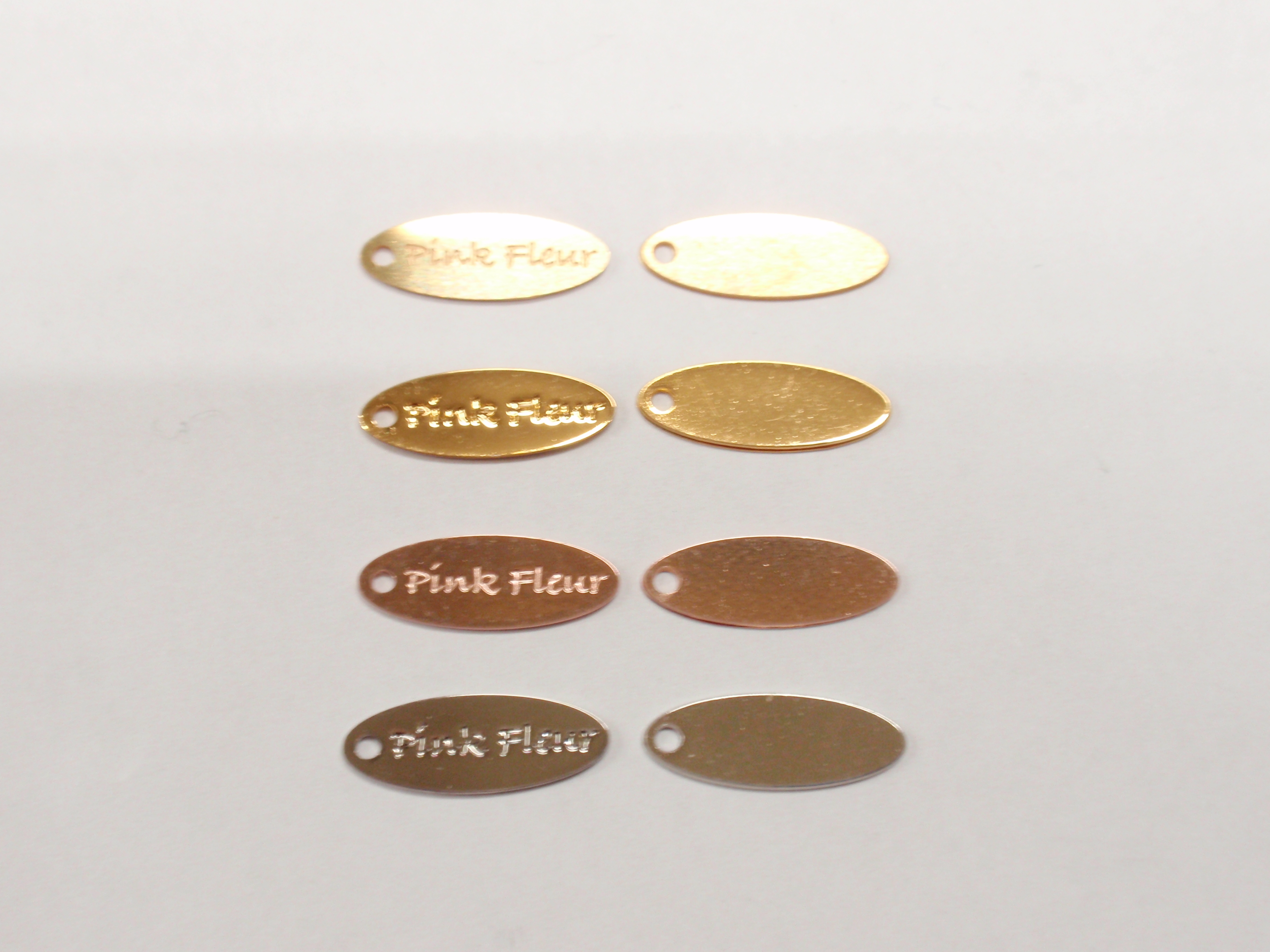 このチャームはアパレル商品に使いたいという事でご依頼を頂いたもので、これも同じように真鍮にメッキを施してエッチング加工で文字を入れさせていただきました。写真の上から、真鍮の生地、ゴールド、ピンクゴールド、シルバーロジュウムになっています。